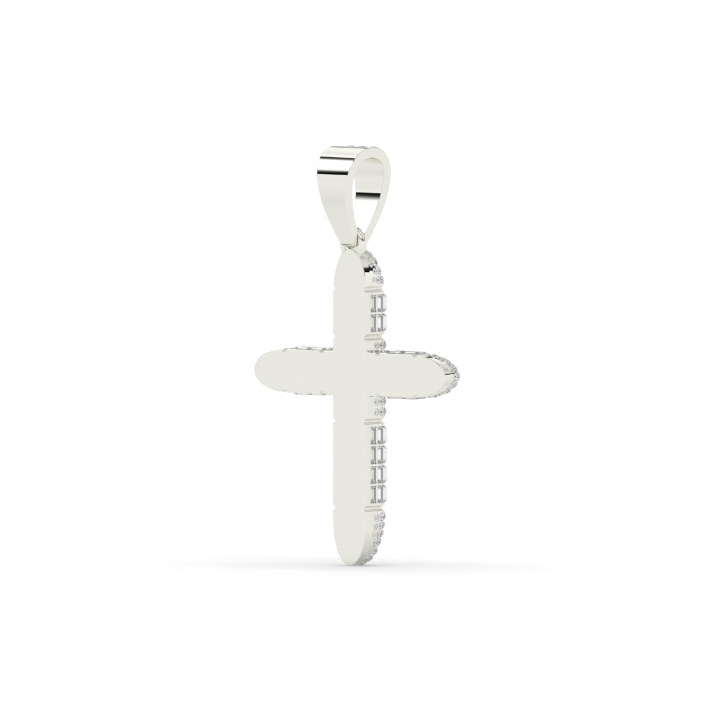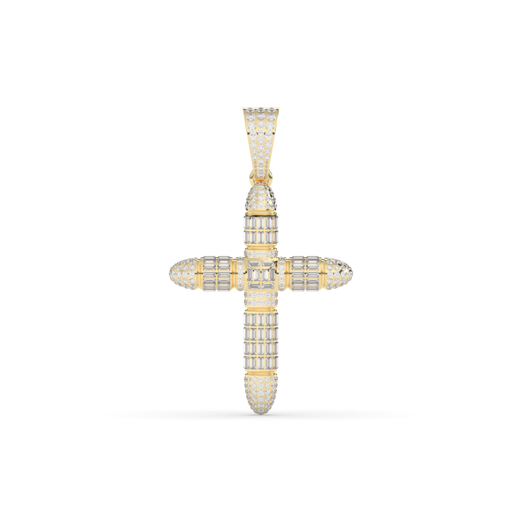 Enhance any outfit with our elegant Baguette Bullet Diamond Cross Pendant. Featuring a stunning 2.37 carat diamond, this pendant has a gross weight of 13.474 grams and a net weight of 13 grams. With 309 individual diamonds and dimensions of 46.00 mm by 28.00 mm, this pendant adds a touch of luxury to your look.