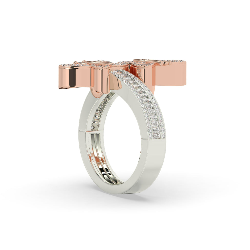 This Twin Butterfly Baguette Diamond Ring showcases a stunning array of 226 diamonds, totaling 1.242 carats. With a gross weight of 6.748 grams and a net weight of 6.5 grams, this ring is expertly crafted to perfection. The height of 23.70 MM adds elegance to your finger while the width of 3.70 MM adds a touch of sophistication. An exquisite choice for any occasion.