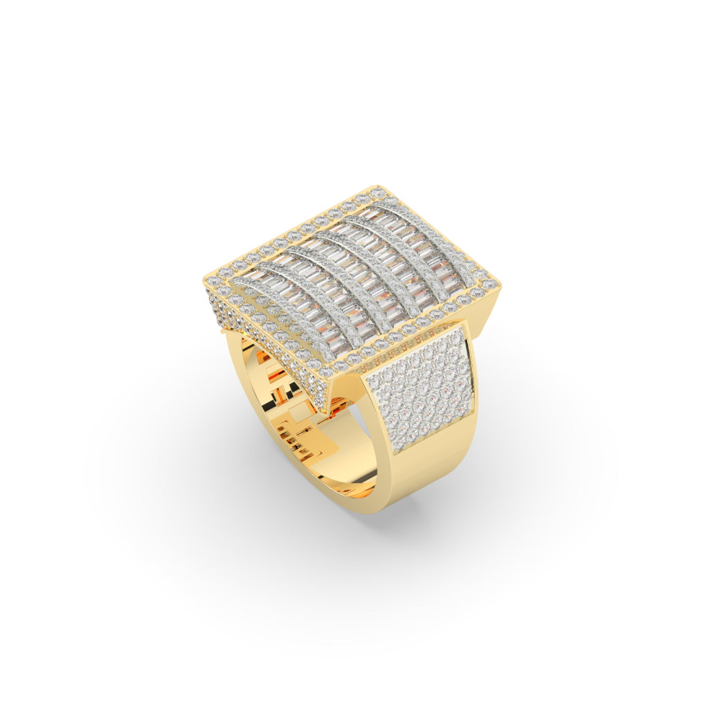 The Baguette Brilliance Wide Gold Ring boasts a stunning design with 346 diamonds totaling 3.91 carats. With a height of 22.00 MM and a width of 6.80 MM, this ring is sure to make a statement. Crafted with a gross weight of 17.282 grams and a net weight of 16.5 grams, it is the perfect combination of elegance and quality.
