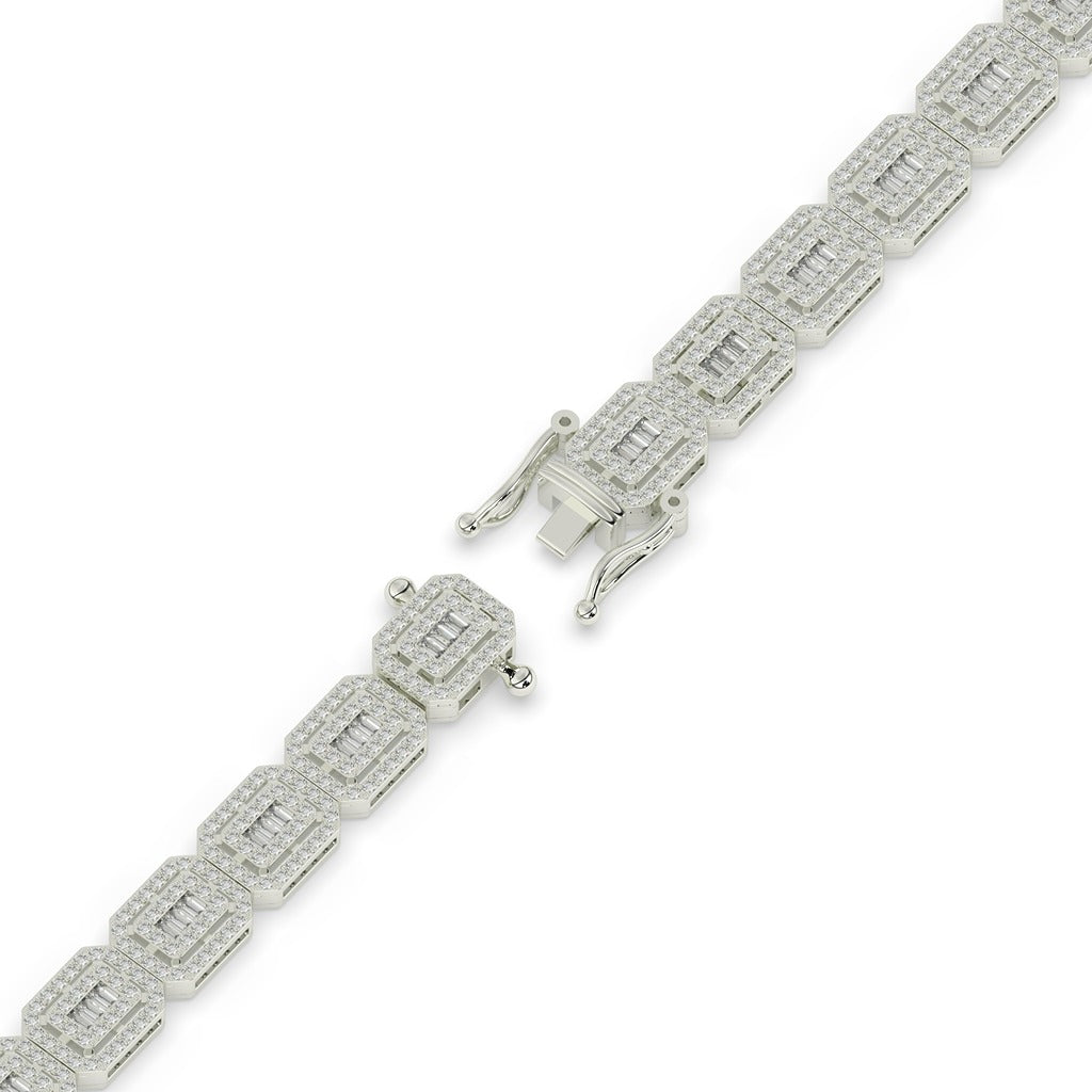 This Baguette Cluster Gold Link Bracelet boasts a substantial gross weight of 33.024 grams and dazzling diamond weight of 5.12 carats. With 703 diamond pieces intricately arranged in a 177.8 MM (7.00 INCH) gold link, this 14.00 MM (0.55 INCH) bracelet adds luxurious style and a touch of glamour to any outfit.