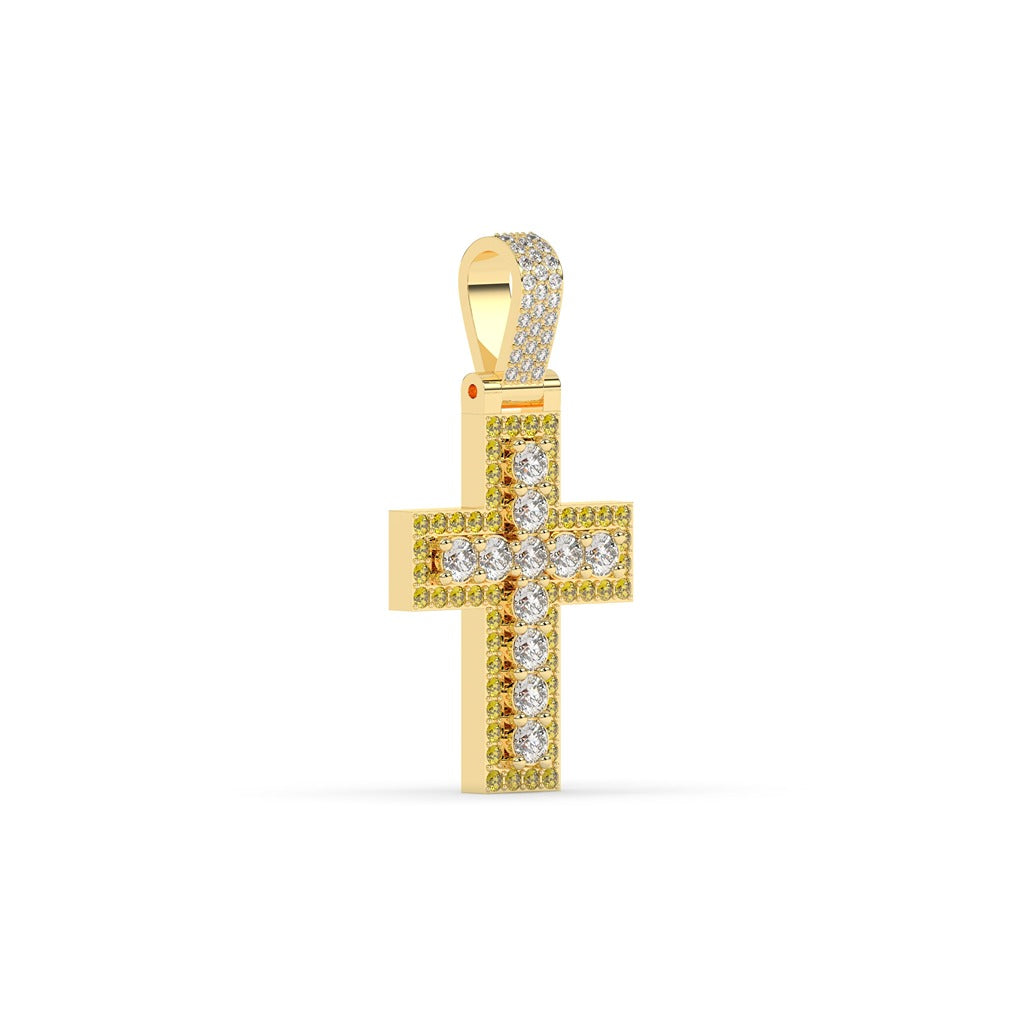 Crafted with precision, this Bold Round Diamond Cross Pendant boasts a gross weight of 8.432 and a net weight of 8. Adorned with 38 sparkling diamonds weighing 1.42 carats, and 52 stones weighing 0.74 carats, this exquisite piece stands at 38.20 MM in height and 20.00 MM in width. Elevate your style with this elegant and expertly crafted pendant.