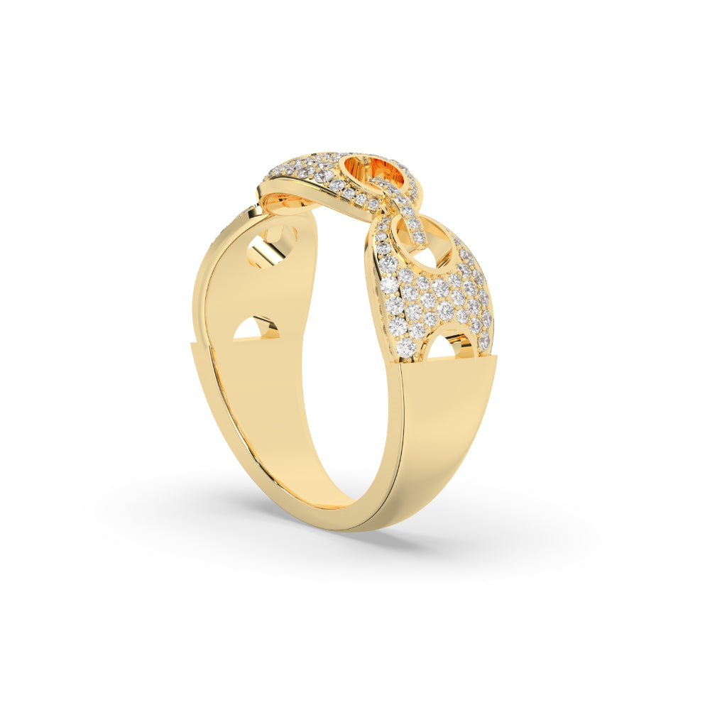 Experience luxury with our Diamond Link Chain Gold Ring. Featuring 124 stunning diamonds totaling 0.716 carats, this ring is sure to make a sparkling and bold statement. With a gross weight of 7.443 grams and a sleek height of 8.60 MM and width of 3.40 MM, this ring is the perfect statement piece for any occasion.