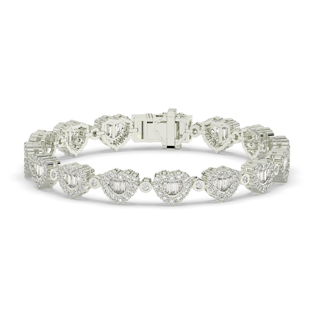 Expertly crafted, this Gold Heart Baguette Diamond Bracelet boasts a gross weight of 20.106 and a net weight of 19. With 306 sparkling diamond pieces totaling 5.53 carats, this bracelet is sure to make a stunning statement. Measuring 203.20 MM in height and 7.35 MM in width, it is a timeless piece of jewelry that exudes elegance and sophistication.