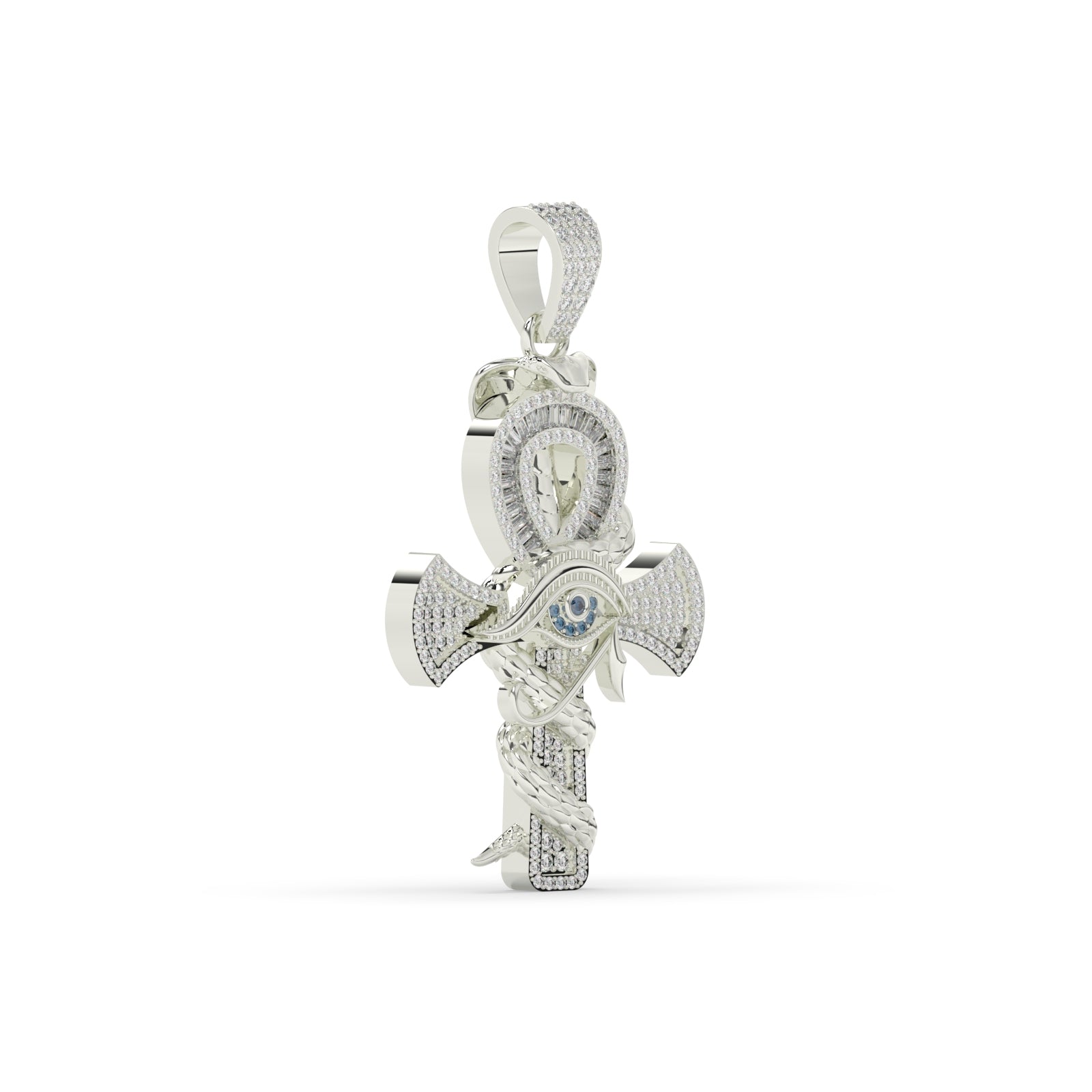 This Iced Ankh Eye Snake Pendant boasts a stunning net weight of 18 grams, with a total diamond weight of 1.358 carats and 208 diamond pieces. The intricately designed pendant also features 7 additional stones, adding a touch of elegance to the 50.80mm x 28.50mm pendant. Elevate your style with this exquisite piece.