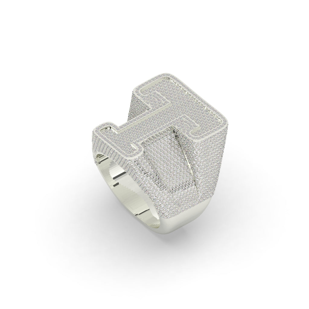 The Iced Bold T Statement Ring boasts a stunning net weight of 20 grams and a dazzling diamond weight of 5.06 carats, with 1707 diamond pieces. Its sleek design stands at 25.00mm in height and 7.00mm in width, making it a bold addition to any outfit. Elevate your style with this elegant and eye-catching ring.