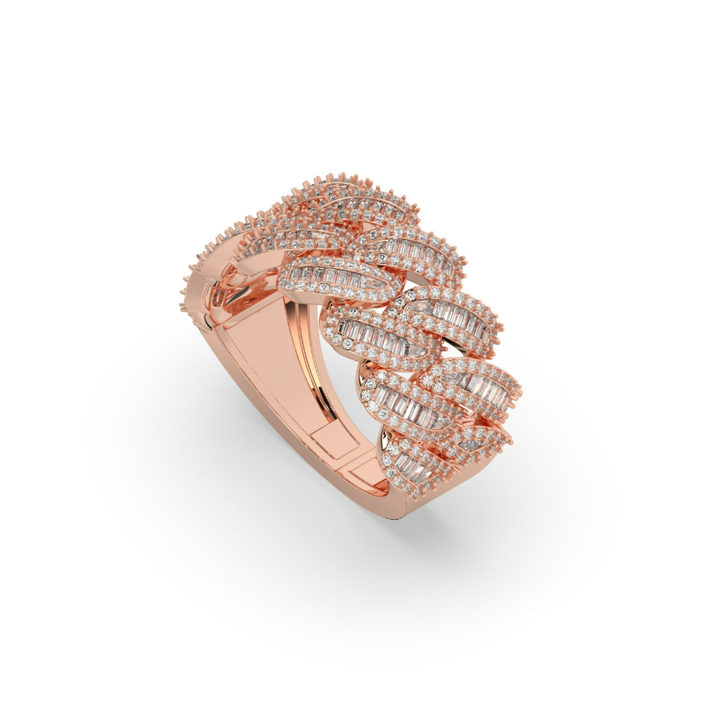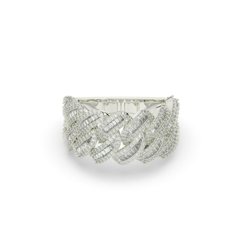 This Iced Cuban Link Diamond Ring weighs 7.886 grams and features a net weight of 7.5 grams. With a stunning diamond weight of 1.93 carats and 414 individual diamonds, this ring offers a height of 12.20 mm and a width of 3.55 mm. Elevate any look with this elegant and luxurious accessory.