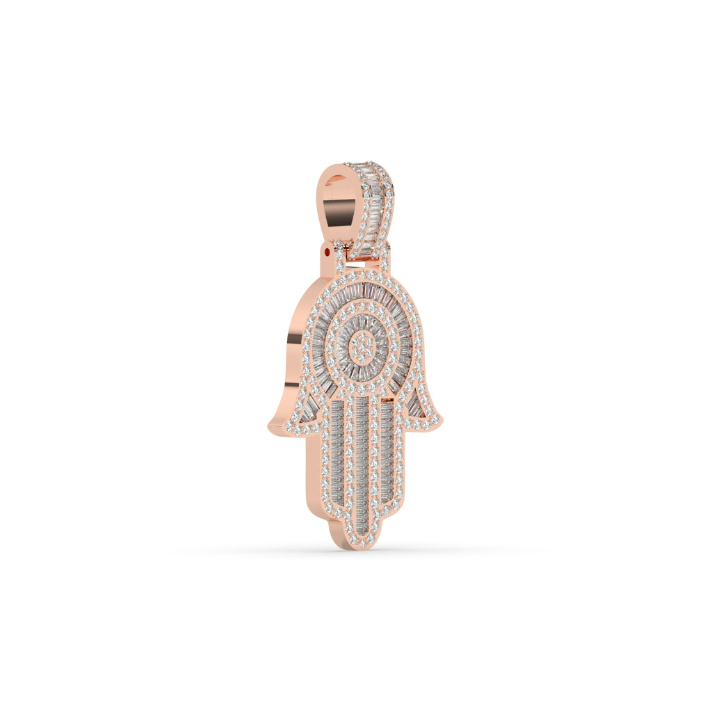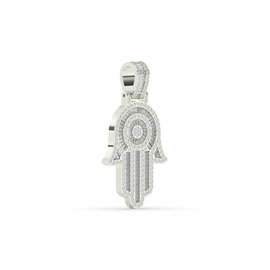 This Iced Hamsa Hand Diamond Pendant boasts a stunning 1.68 carats of diamonds, with a total gross weight of 10.336 grams and a net weight of 10 grams. Measuring 25.40 MM in height and 18.90 MM in width, this pendant is a beautifully crafted piece of jewelry that will make a statement for any occasion.
