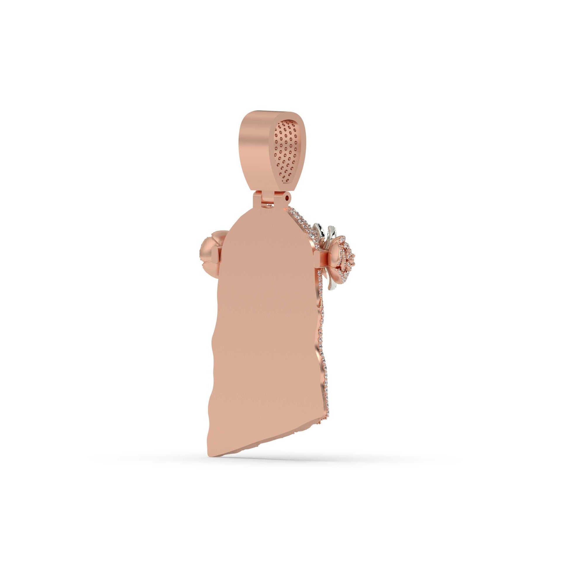 Expertly crafted in the shape of a rose, this pendant is adorned with 764 diamonds totaling 10.6 carats. With a net weight of 55 grams and a gross weight of 57.12 grams, this beautiful piece measures 59.00mm by 42.00mm. Make a statement with this stunning Jesus Rose Crown Diamond Pendant.