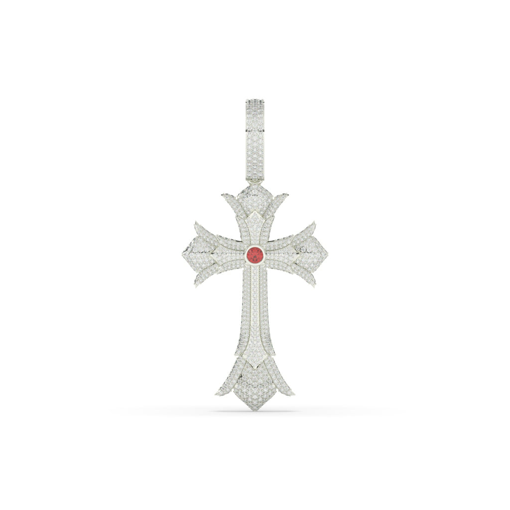 Expertly crafted, this Red Center Gothic Cross Pendant boasts a gross weight of 16.974 and a net weight of 16. Adorned with 4.7 carats of dazzling diamonds and a single 0.17 carat stone, it stands at 51.00mm in height and 32.00mm in width. Elevate any outfit with this stunning piece.