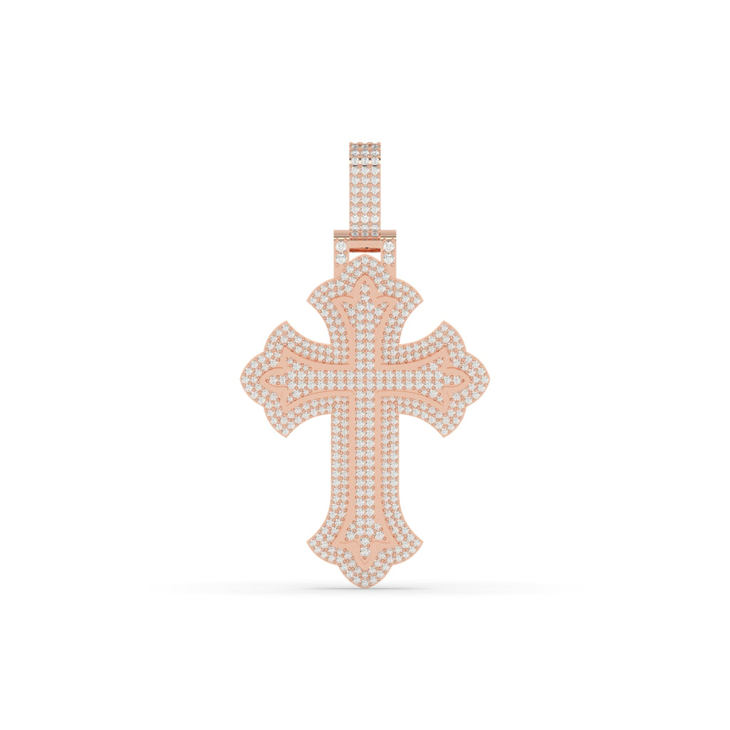 As a product expert, I present to you the Rose Gold Outlined Cross Charm. This exquisite charm has a gross weight of 15.338, diamond weight of 1.69, and a height of 51.00 MM (2.00 INCH). With 415 diamond pieces, it is the perfect addition to your jewelry collection. Its elegant design and precise measurements of 28.50 MM (1.10 INCH) make it a beautiful and timeless piece to wear.