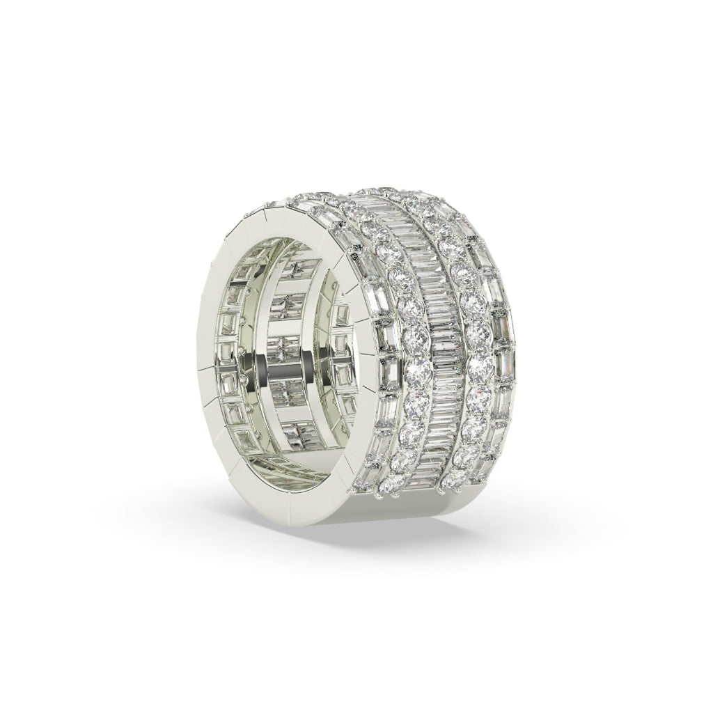 This round baguette fusion eternity ring boasts a stunning 8.8 carat diamond weight, comprised of 148 individual diamonds. Elegantly designed with a height and width of 14.00 MM, this ring is sure to make a statement. With a gross weight of 23.76 and a net weight of 22, this ring is both stylish and substantial, making it the perfect addition to any jewelry collection.