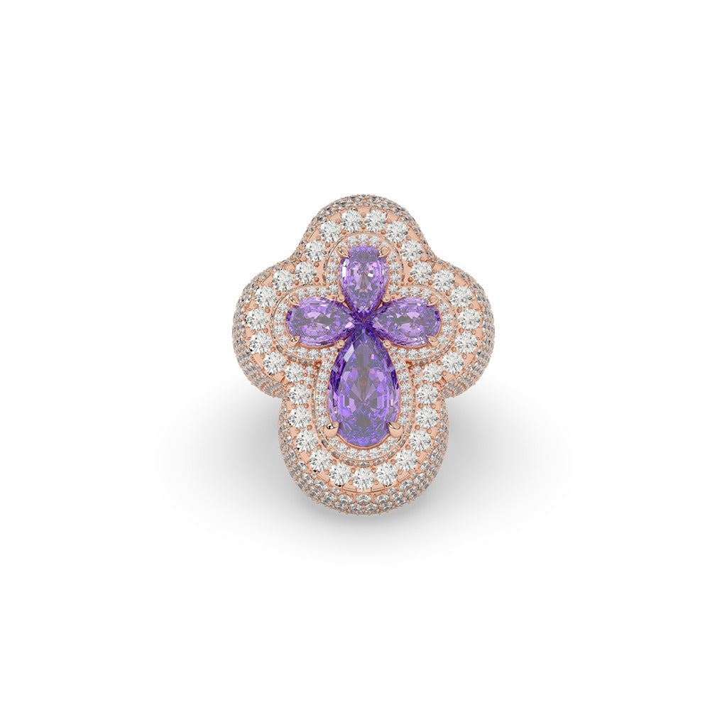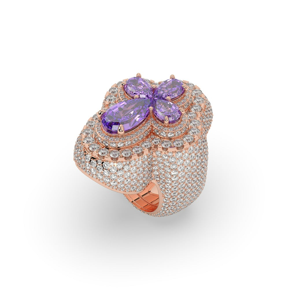 Elevate your style with this stunning Royal Bloom Purple Diamond Ring. Featuring a Gross Weight of 21.558 grams and a Net Weight of 18.7 grams, this ring exudes luxury. 8.92 carats of diamonds, arranged in 583 pieces, add a touch of sparkle and glamour. With a height of 28.13 mm and a width of 12.00 mm, this ring is a true statement piece.