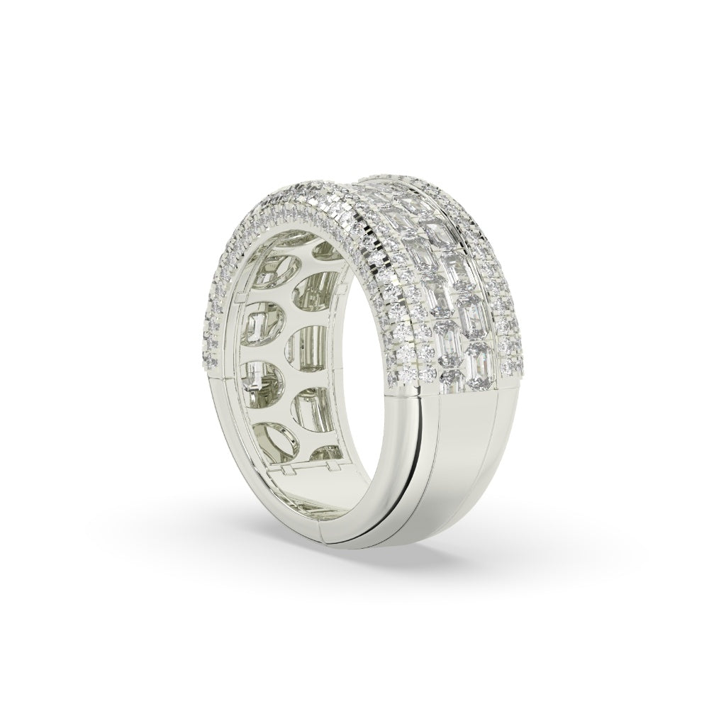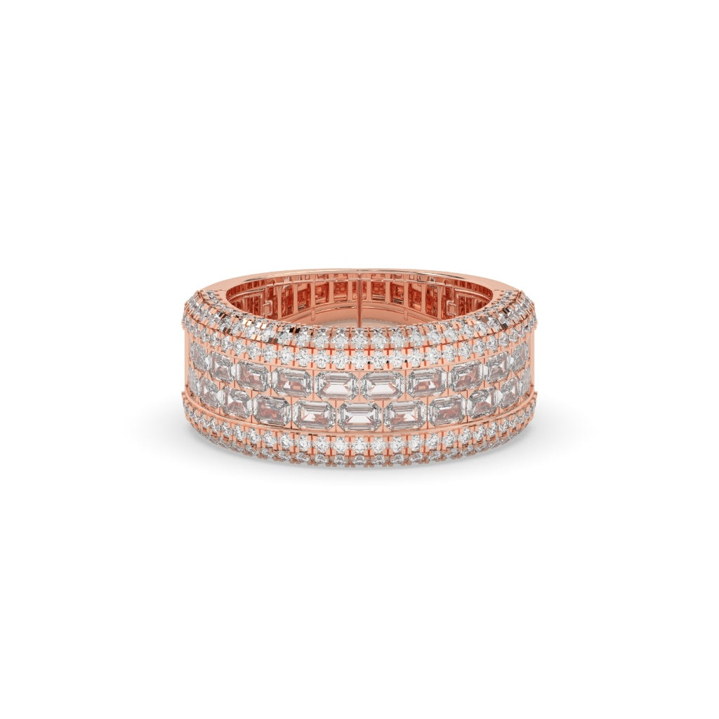 This exquisite Royal Radiance Emerald Diamond Band boasts a gross weight of 12.756 and a sparkling net weight of 12.5. With a stunning diamond weight of 3.38 and 175 diamond pieces, this band Radiates elegance and luxury. Measuring 10.20 MM in height and 8.10 MM in width, it is an enchanting addition to any ensemble.