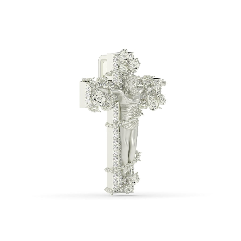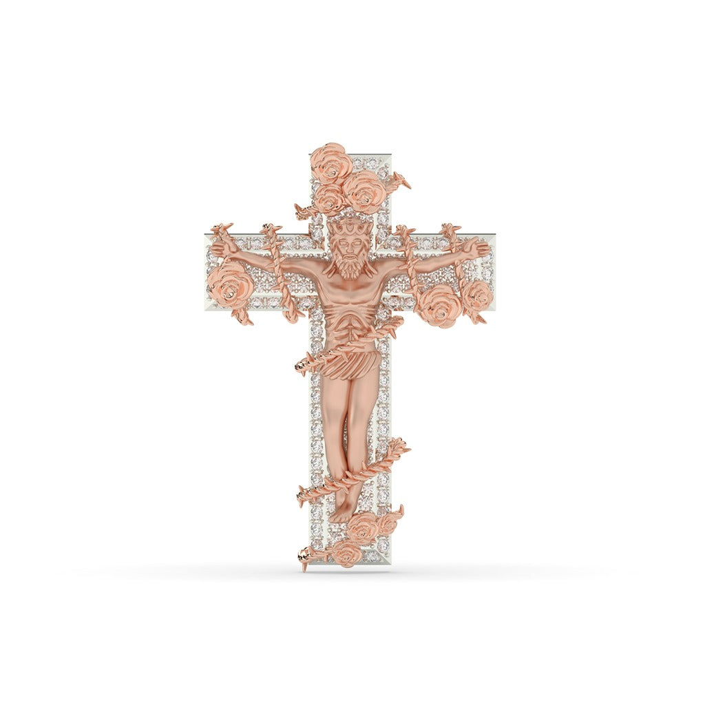 This elegant Sacred Jesus pendant features intricate flower details and a total of 228 diamonds weighing 3.675 carats. With a gross weight of 28.735 and a net weight of 28 grams, this pendant measures 52.00 MM in height and 36.50 MM in width. Perfect for those seeking a luxurious and meaningful accessory to add to their collection.