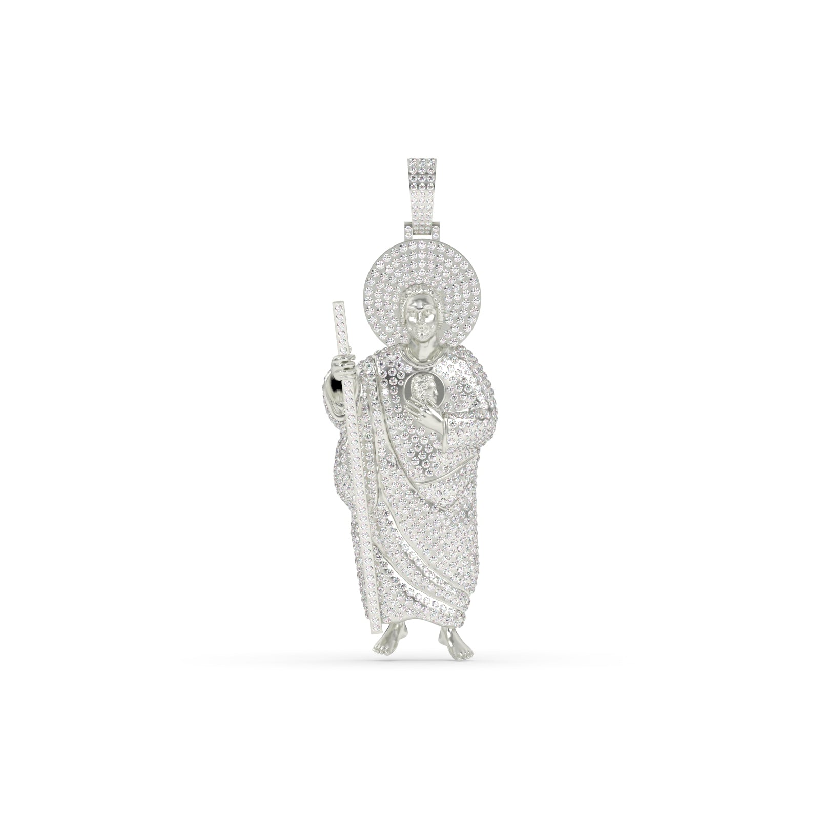 Add a touch of elegance to your outfit with our Saint Jude Diamond Gold Pendant. With a gross weight of 72.935 g and a net weight of 70 g, this pendant features 14.676 carats of dazzling diamonds in 1787 pieces. Measuring 114.50 mm in height and 40.00 mm in width, this pendant is sure to make a statement.