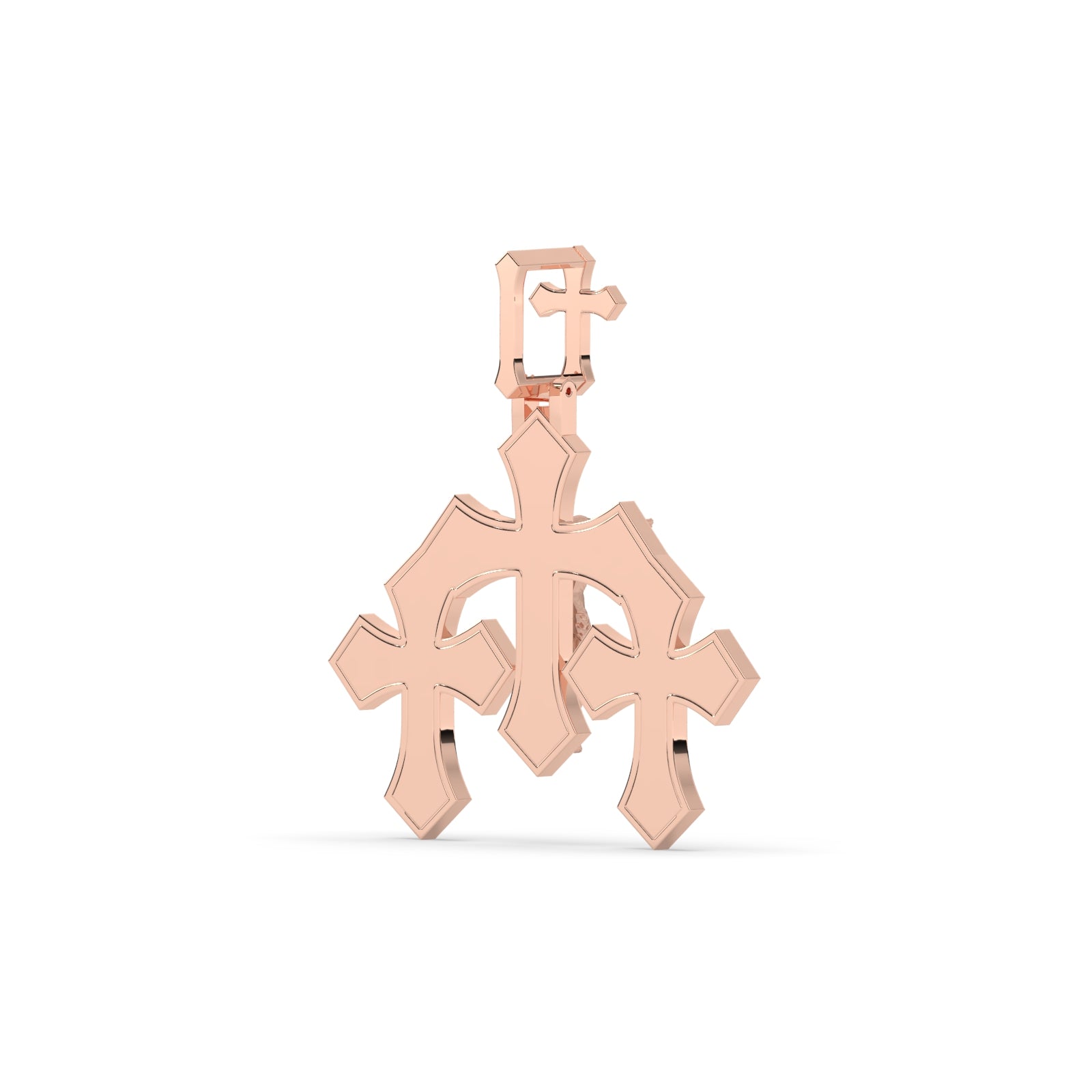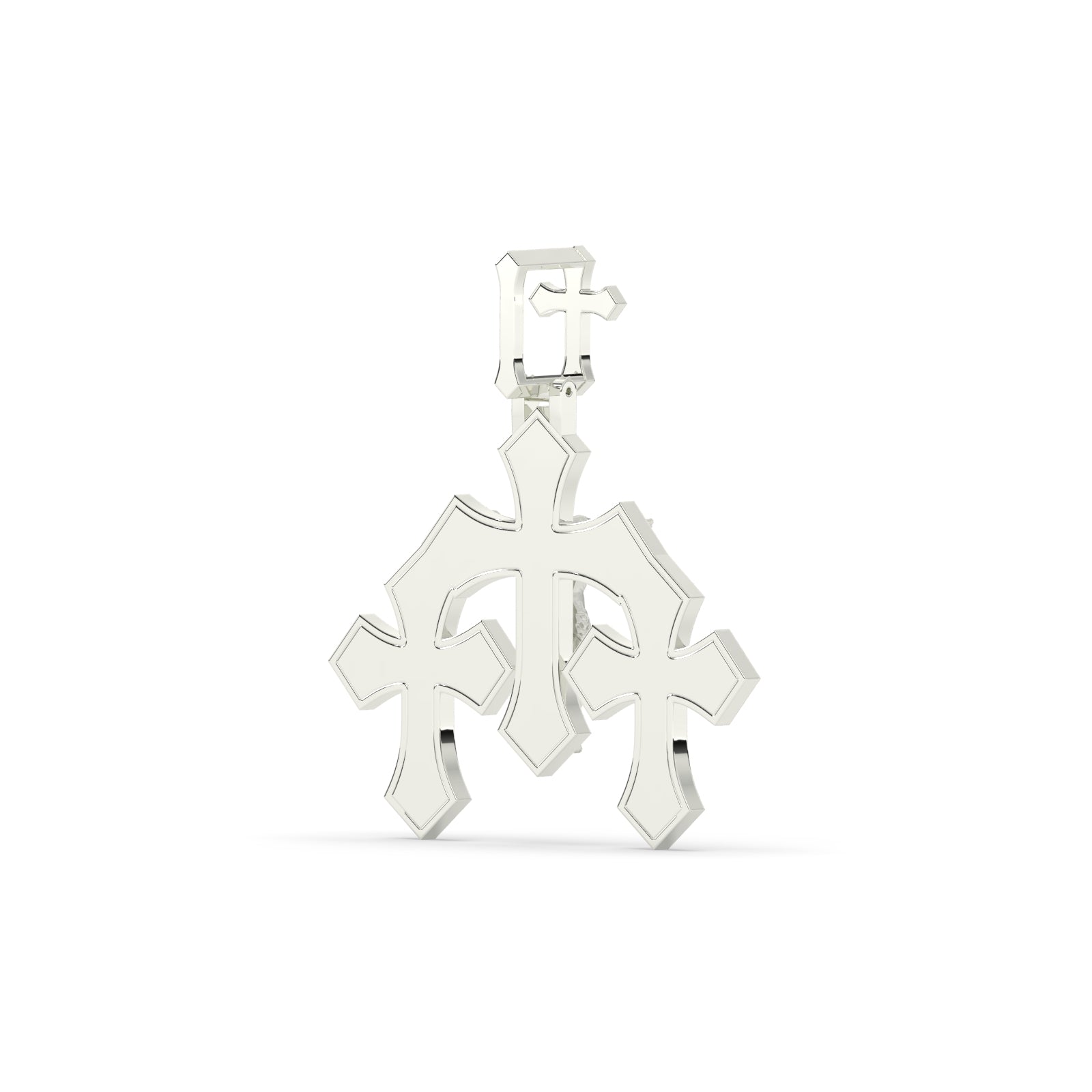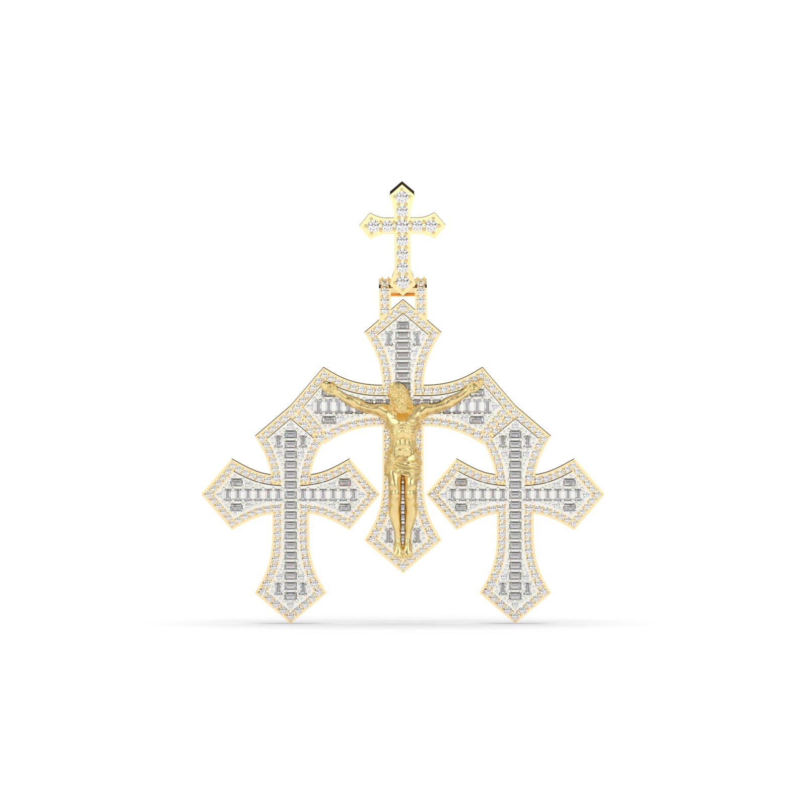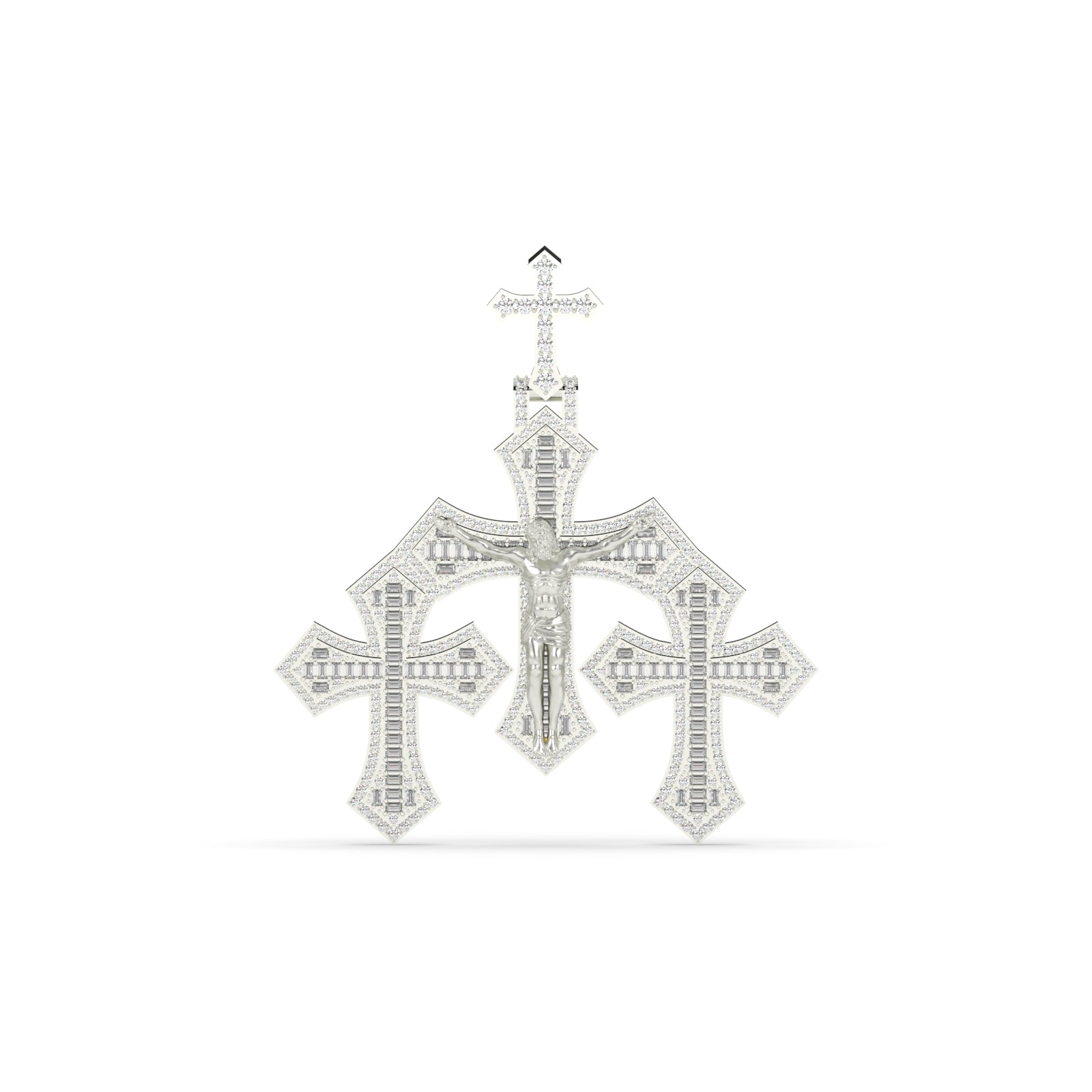 This Triple Cross Jesus Pendant Charm boasts a gross weight of 18.538 and a net weight of 18. It features a stunning diamond weight of 2.69 and 465 sparkling diamond pieces. The pendant stands at a height of 38.15 MM (1.50 INCH) and has a width of 47.20 MM (1.85 INCH). Elevate your style and faith with this exquisite piece.