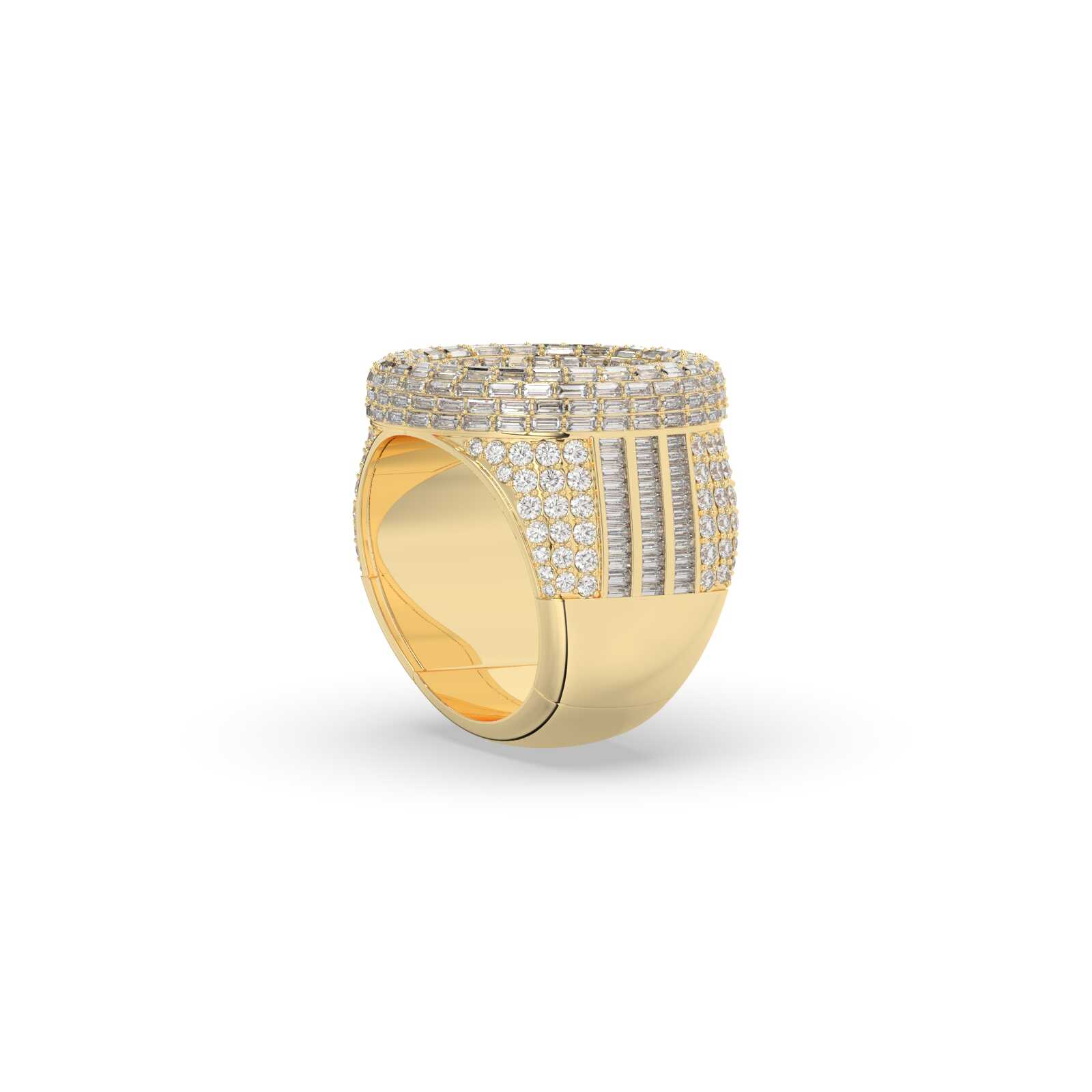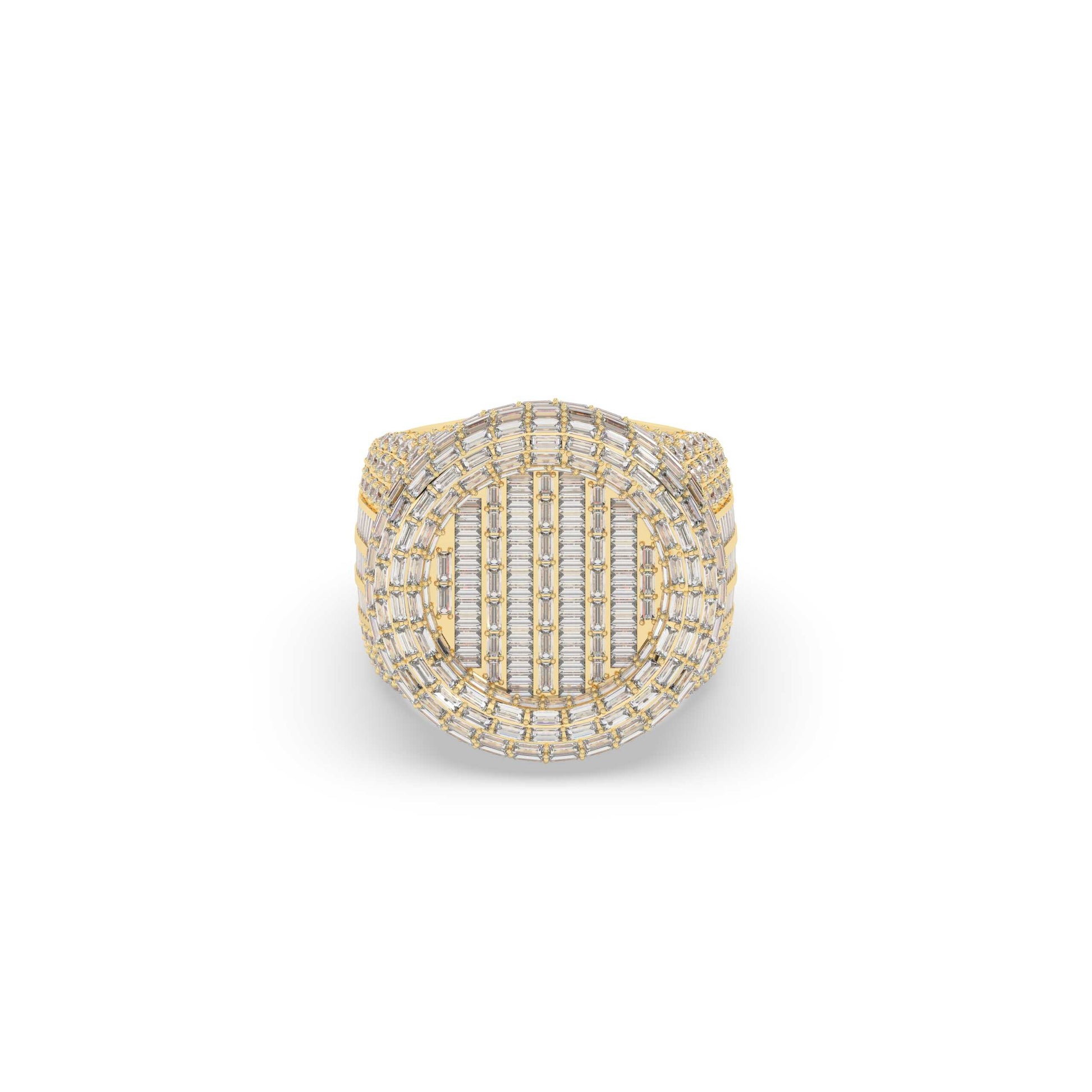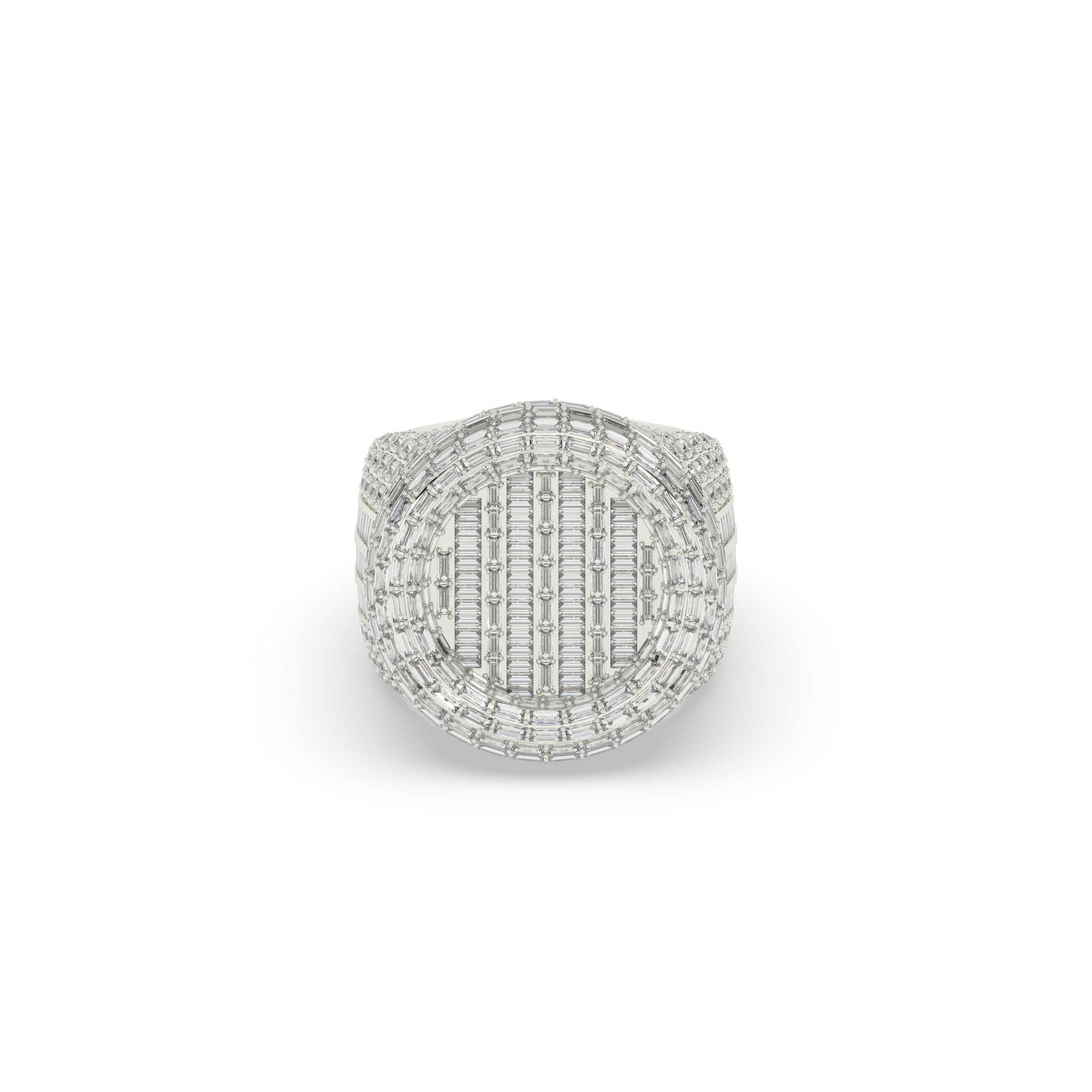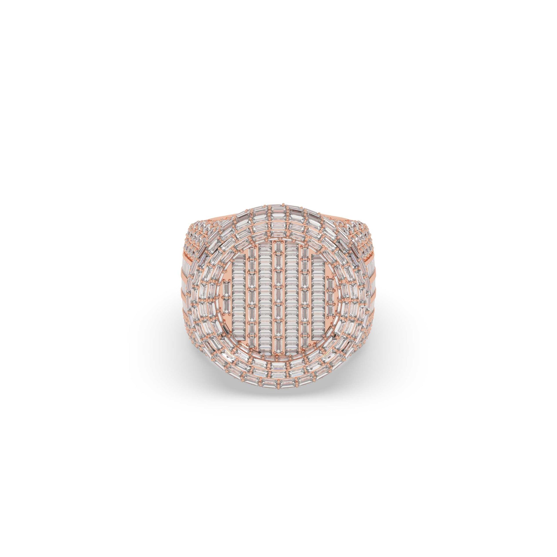 This Triple Line Baguette Circle Ring features 440 sparkling diamonds with a total weight of 9.168 carats. Made with precision, it has a height of 24.00 mm and a width of 10.0 mm, making it a stunning and elegant piece. With a gross weight of 23.834 grams and a net weight of 22 grams, this ring is both lightweight and durable, providing comfort and quality.
