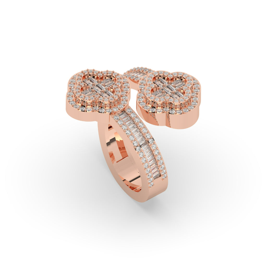 The Twin Clover Rose Gold Ring boasts a stunning design with a total diamond weight of 1.42 and 218 pieces. Its height of 21.50 MM and width of 4.00 MM add to its elegant look. With a gross weight of 11.358 and a net weight of 11, this ring is both beautiful and substantial.
